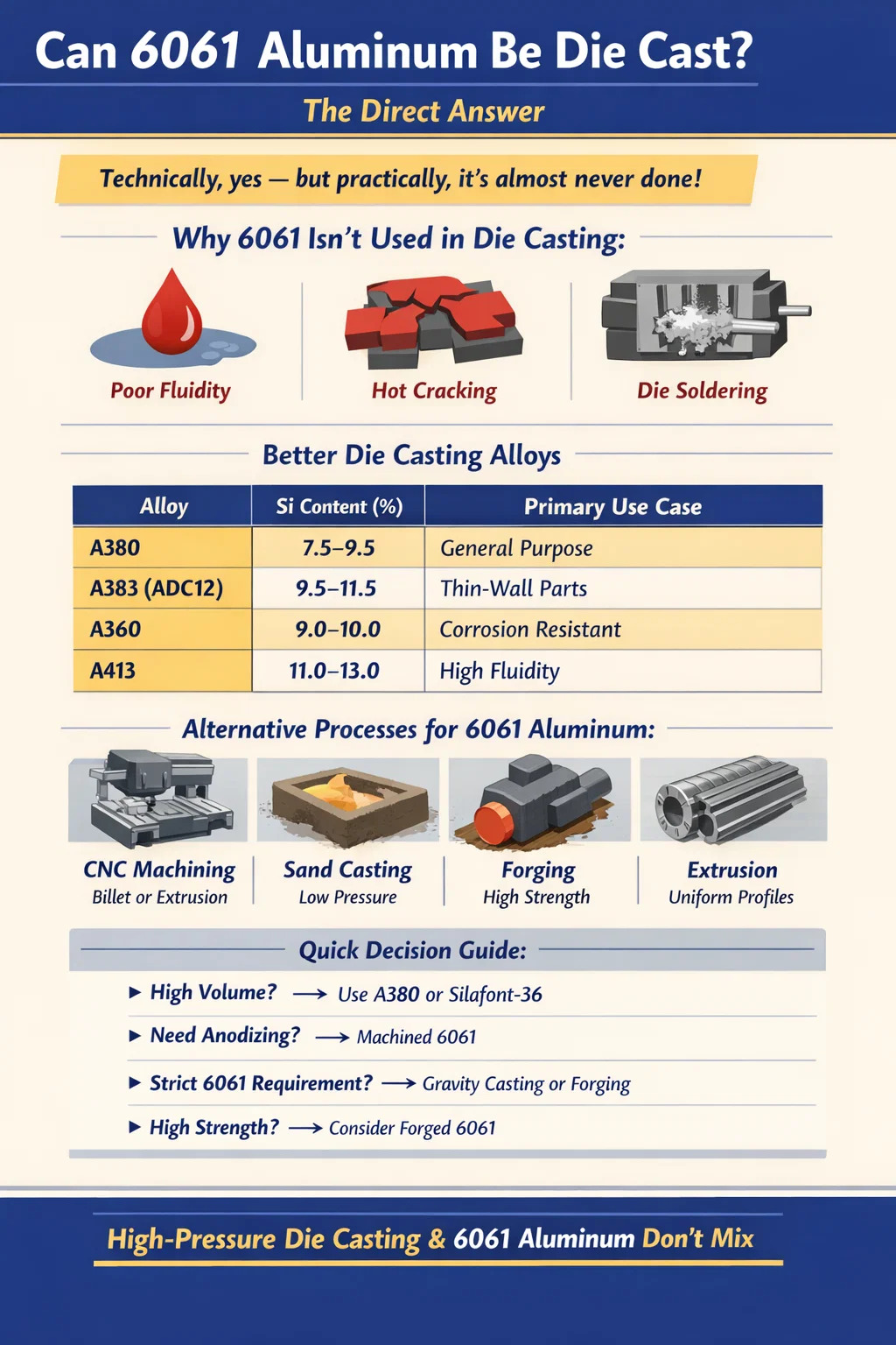 من الناحية الفنية، نعم - ولكن في التصنيع العملي، لا يتم استخدام الألومنيوم 6061 أبدًا في صب القوالب ، وستنصح معظم مرافق صب القوالب بعدم القيام بذلك. السبب يعود إلى كيمياء السبائك. 6061 عبارة عن سبيكة ألومنيوم مشغولة، مما يعني أنها تم تصميمها خصيصًا لعمليات مثل البثق والدرفلة والتزوير - وليس للحقن في قوالب الفولاذ تحت ضغط عالٍ. على الرغم من أن محتواه من المغنيسيوم والسيليكون ممتاز للأداء الهيكلي بعد المعالجة الحرارية، فإنه يخلق مشاكل خطيرة في بيئة الصب بالقالب: ضعف السيولة، وميول التكسير الساخن، ومشكلات لحام القوالب التي تؤدي إلى ارتفاع معدلات الخردة وتكاليف الأدوات.
