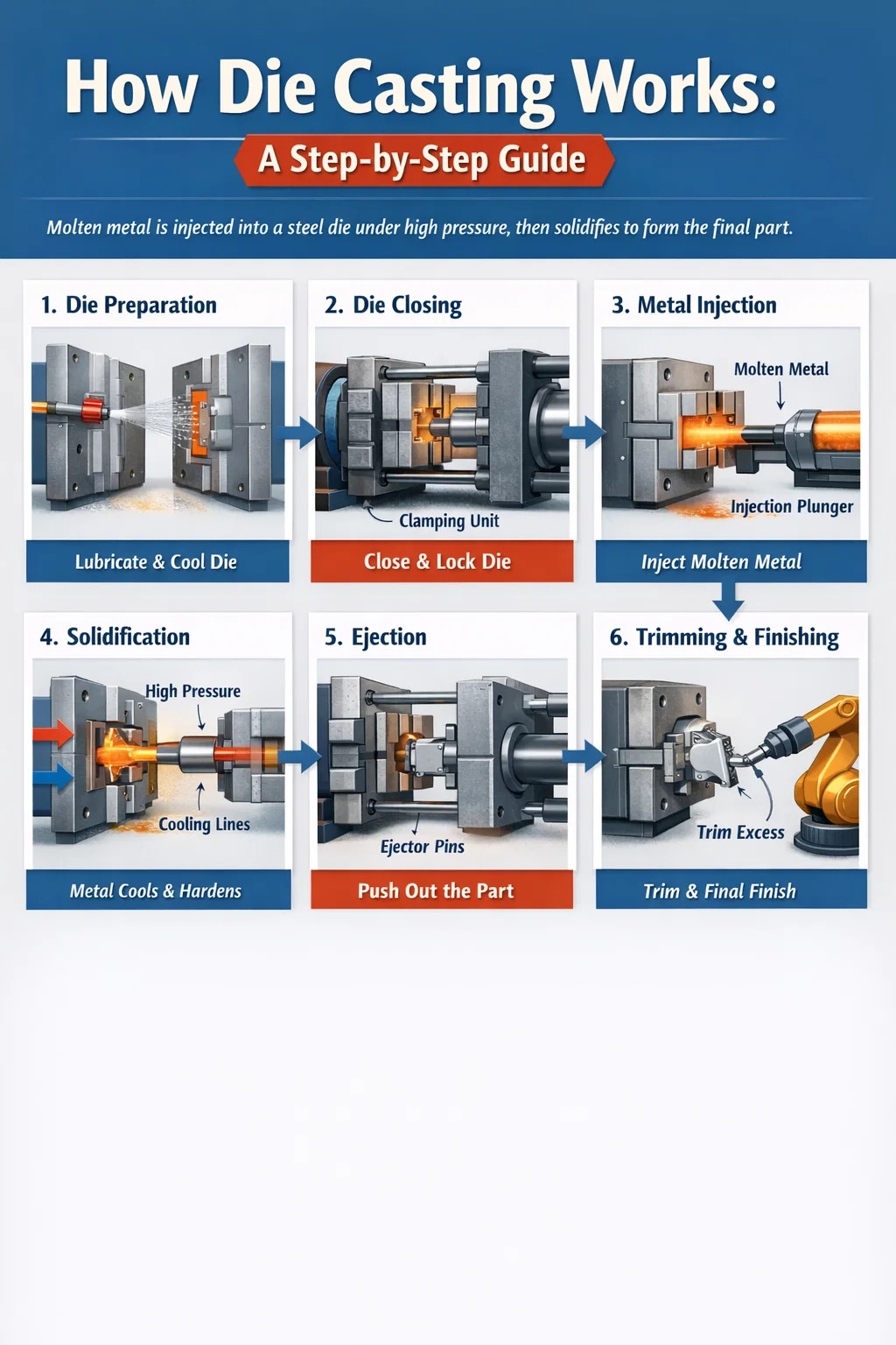 يتطلب فهم كيفية إجراء عملية الصب بالقالب السير خلال كل مرحلة من مراحل دورة الإنتاج. في حين أن الآلات والسبائك المختلفة تقدم اختلافات، فإن التسلسل الأساسي ثابت في جميع أنحاء الصناعة.