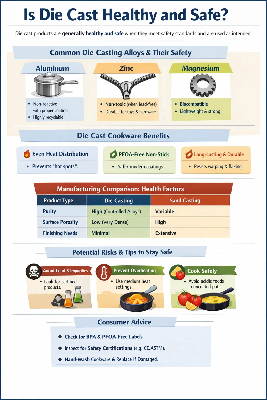 في الأسواق غير المنظمة، يمكن استخدام الخردة المعدنية في يموت الصب عملية. يمكن أن يؤدي ذلك إلى إدخال الرصاص أو الكادميوم أو الزرنيخ. للبقاء بصحة جيدة، قم بالشراء دائمًا يموت الصب المنتجات التي تحمل شهادات مثل موافقة ادارة الاغذية والعقاقير للاتصال بالطعام أو الامتثال لـ RoHS للإلكترونيات ولعب الأطفال.