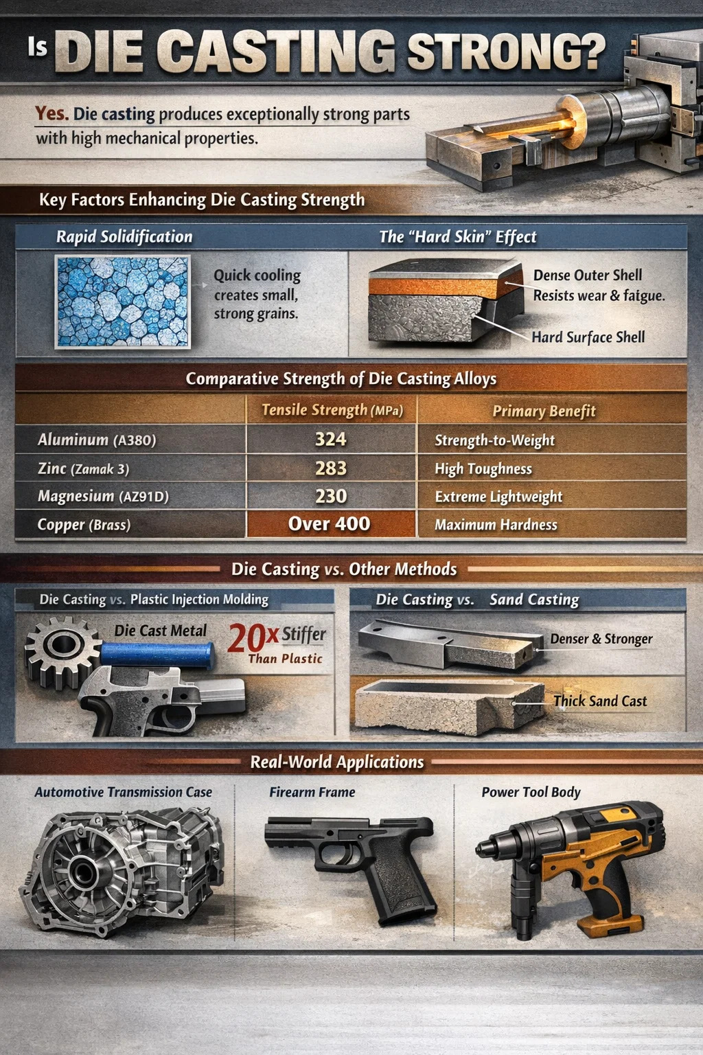 - أدوات البناء: يتم دائمًا تصنيع أجسام مسدسات المسامير وآلات ثقب الصخور ذات الجودة الاحترافية عبر يموت الصب لامتصاص الارتداد المستمر والقطرات على الخرسانة.