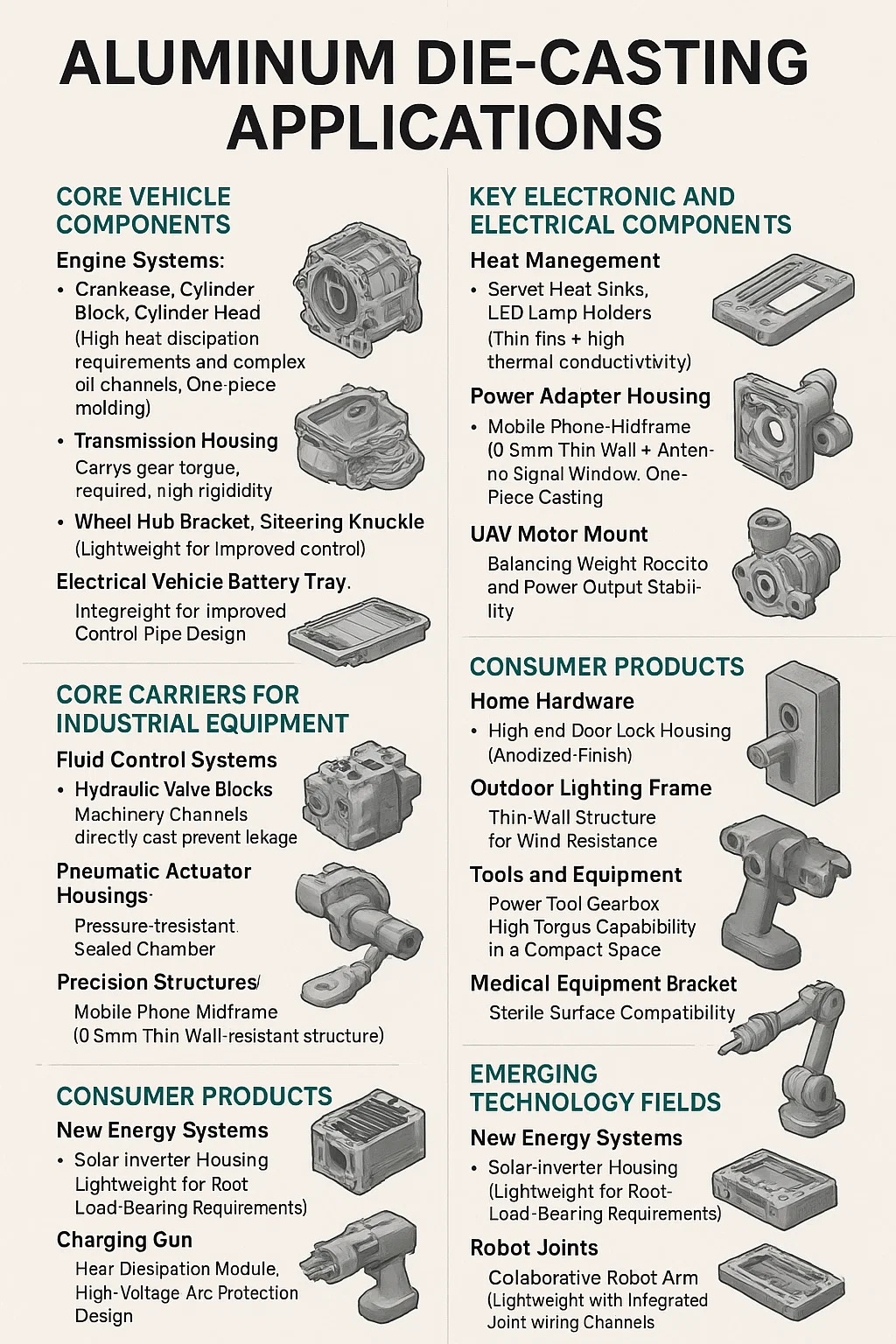 | مواصلات | • كتل المحرك ورؤوس الأسطوانات • علب النقل • أغلفة محركات الدراجة الإلكترونية • حاويات بطارية EV | ▪ يعالج الإجهاد الحراري العالي القنوات النفط/الماء يلقي في مكانها ▪ 30 ٪ أخف من الصلب |