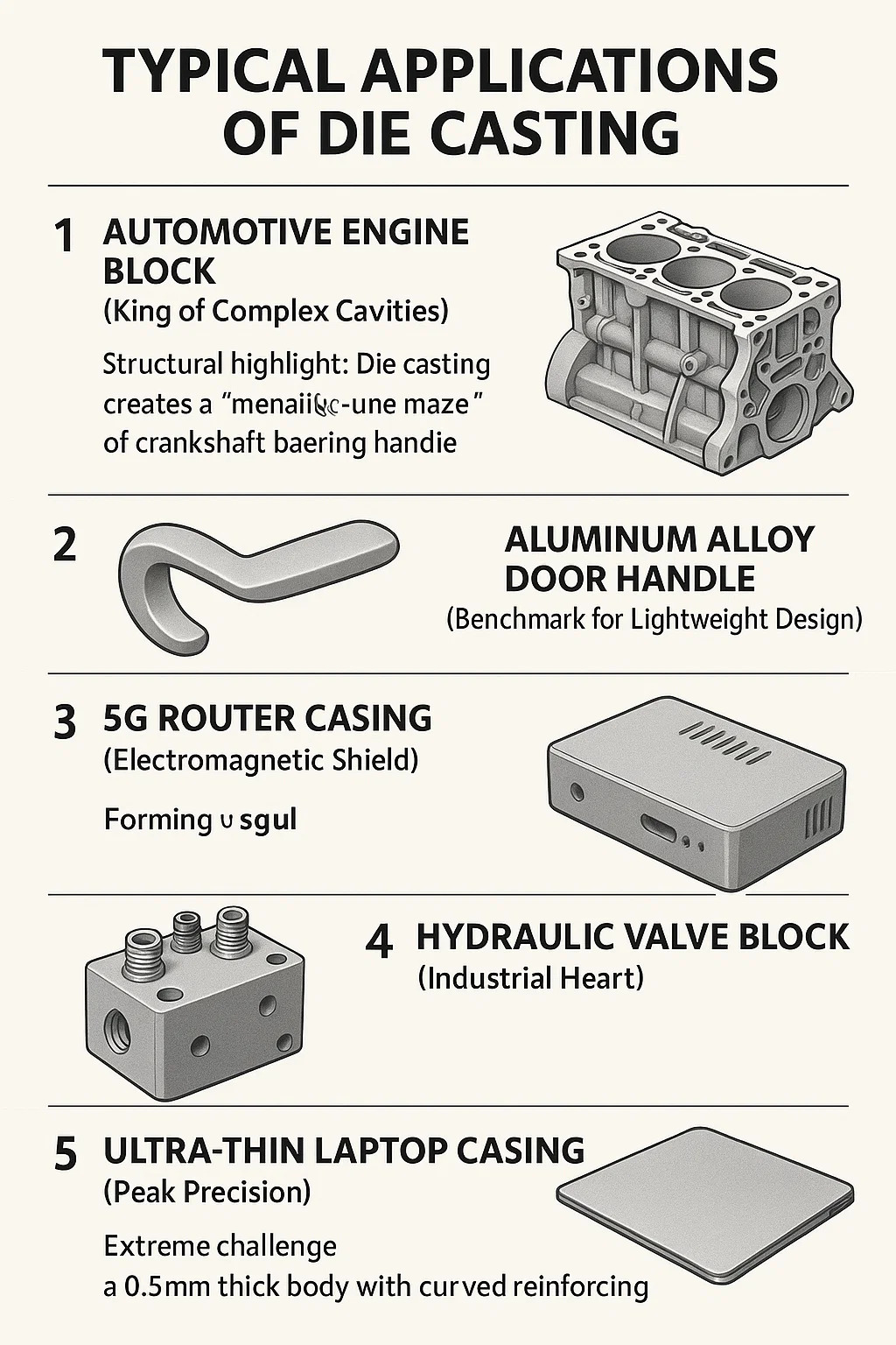 أبرز المعالم الهيكلية: يموت الصب يخلق "متاهة ثلاثة في واحد" من مبيتات محامل العمود المرفقي، وقنوات مياه التبريد، وممرات النفط في عملية واحدة، يشبه إلى حد كبير صب شبكة من الأنفاق المعدنية المترابطة داخل قالب فولاذي.