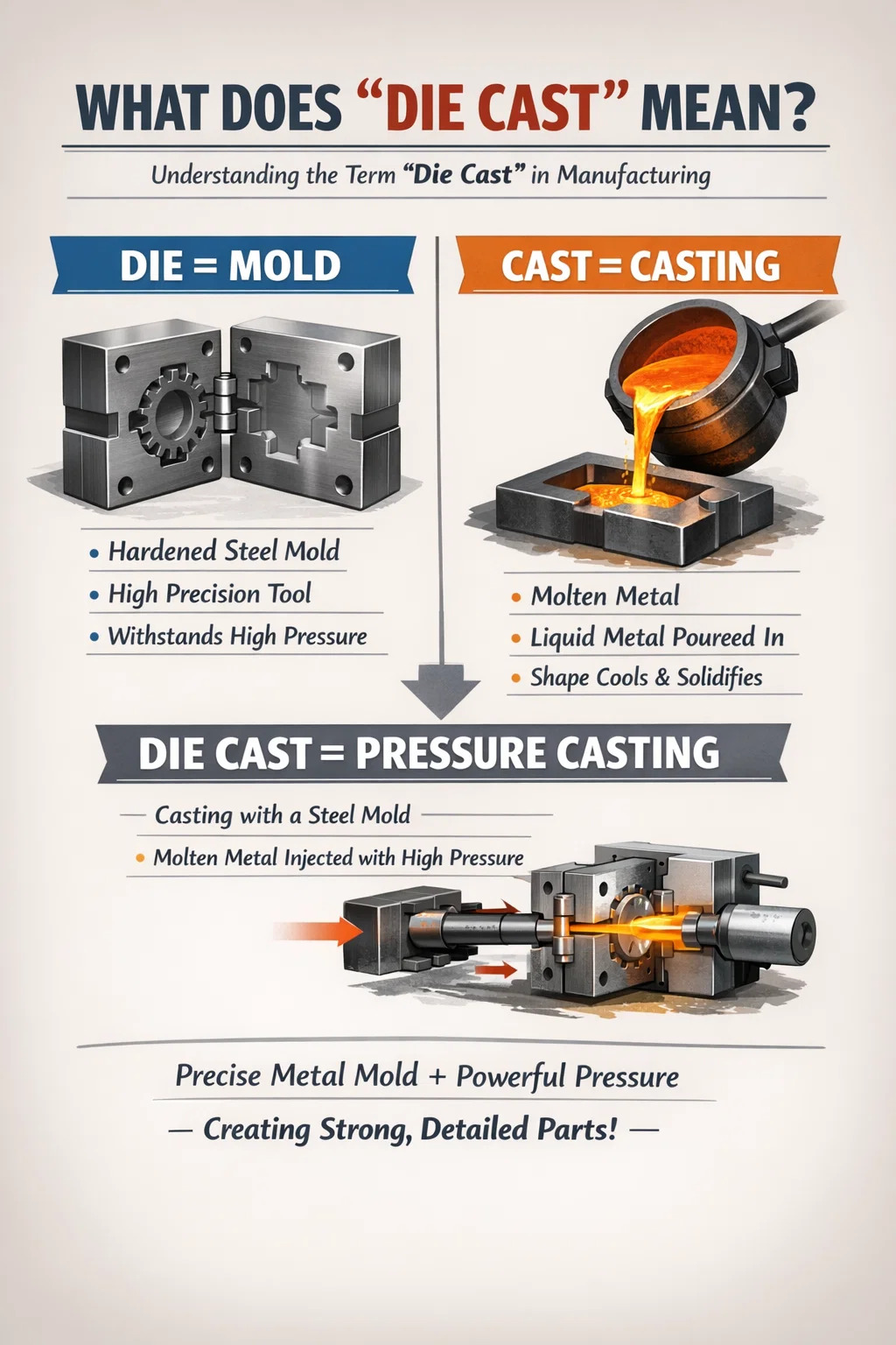 بدمجهاتين الكلمتين في عبارة "يصب في القالب"، وهو المعنى الأساسي هو: صب الضغط باستخدام قالب معدني دقيق.